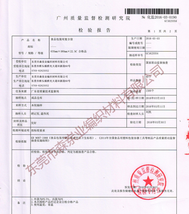 我司生产的产品食品编织袋通过广州质量监督检查研究院的通过报告